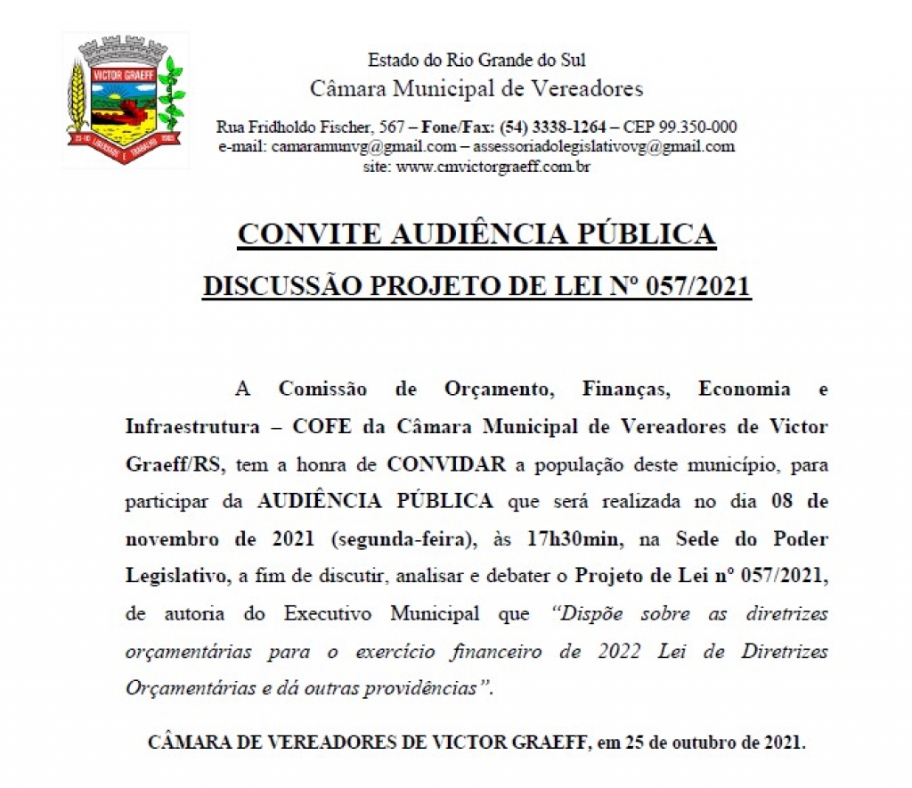A Comissão de Orçamento, Finanças, Economia e Infraestrutura – COFE da Câmara Municipal de Vereadores de Victor Graeff/RS, tem a honra de CONVIDAR a população deste município, para participar da AUDIÊNCIA PÚBLICA que será realizada no dia 08 de novembro de 2021 (segunda-feira), às 17h30min, na Sede do Poder Legislativo, a fim de discutir, analisar e debater o Projeto de Lei nº 057/2021, de autoria do Executivo Municipal que “Dispõe sobre as diretrizes orçamentárias para o exercício financeiro de 2022 Lei de Diretrizes Orçamentárias e dá outras providências”.
